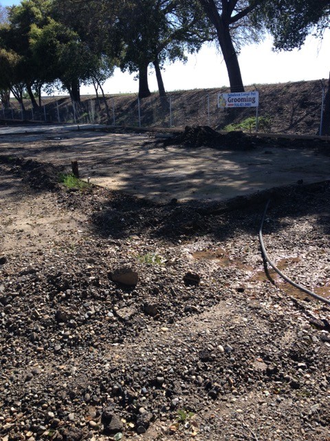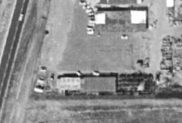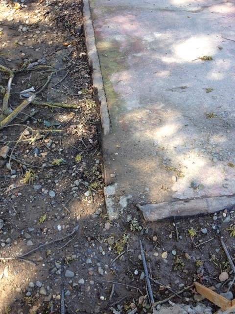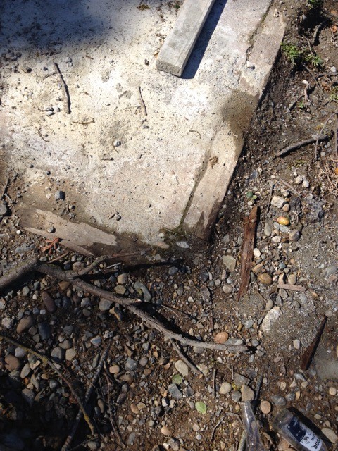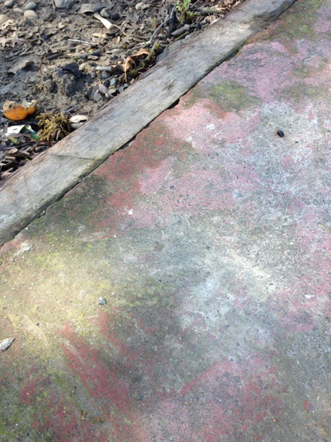 Original concrete pad exists as of 3/2016. Appears to have been painted red with redwood forming
