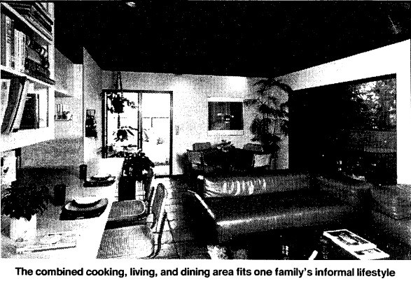 The Fischels carried out a similar simple and modern decorating theme in their paneled living room, with its massive fireplace made of native stones from the bed of the American River. The color scheme is all earth tones, with light beige carpet. The two built-in sofas are complemented by a low square coffee table and two low swivel tub chairs."