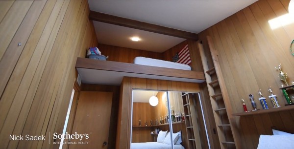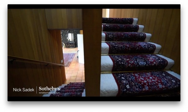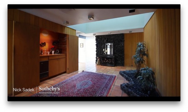 The wood kitchen cabinets are finished with a white epoxy-type paint that gives them a hard, durable surface. The ceiling and beams are stained fir wood. The interior living room, atrium entrance, and hallway of the house are all paneled in mahogany, and the exterior of the house is redwood plywood.