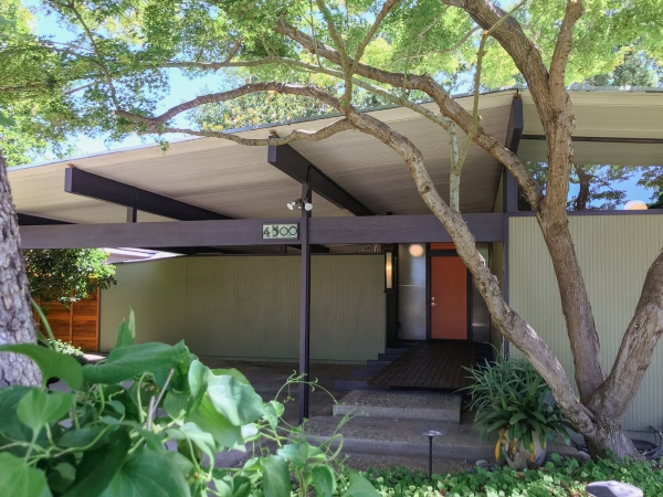 "The house Sparks designed for himself and his family shows what the architect could do when his budget was small. A boxy home with a low, glass-filled gable, the house has open-beams, oddly placed windows, and a simple plank deck overlooking the backyard, which originally had a manmade river.